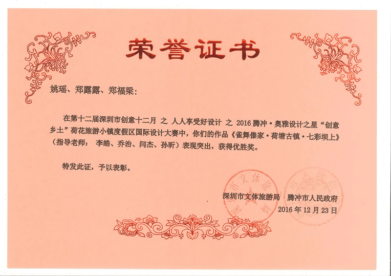 2016年12月23日,在云南省腾冲市举办的2016腾冲•奥雅设计之星国际高校设计大赛决赛暨“创意乡土”新型文旅发展高峰论坛中,由太阳成tyc122cc环艺系教师李皓、乔治、闫杰、孙昕共同指导的环艺系员工姚瑶、郑露露、郑福梁作品《雀舞傣家•荷塘古镇•七彩坝上》经过多轮激烈角逐,顺利通过最终评审,荣获本次设计大赛优胜奖。