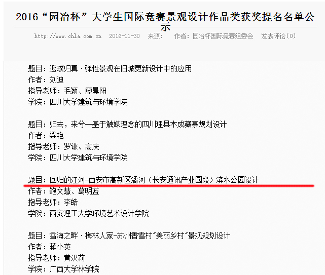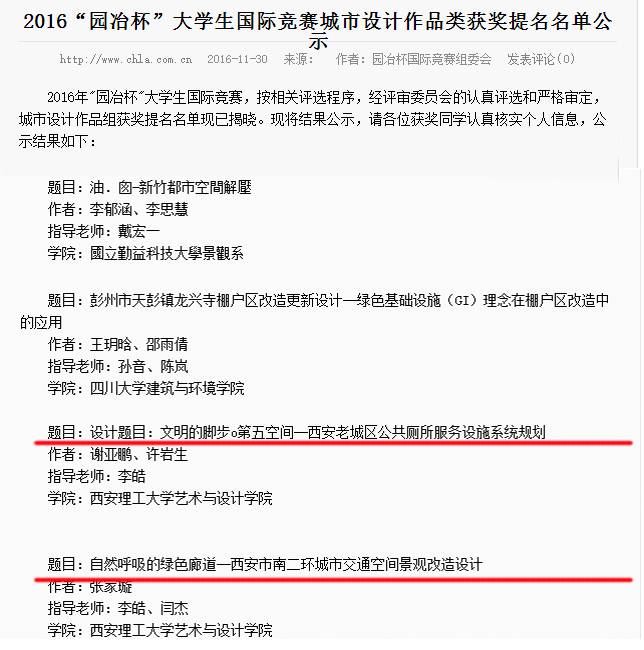 11月30日,2016年“园冶杯”老员工国际竞赛,按相关评选程序,经评审委员会的认真评选和严格审定,城市设计作品组、景观设计作品类获奖提名名单现已揭晓,由太阳成tyc122cc环境设计系李皓老师、闫杰老师指导的员工谢亚鹏、许岩生设计作品《文明的脚步•第五空间——西安老城区公共厕所服务设施系统规划》、员工张家璇设计作品《自然呼吸的绿色廊道——西安市南二环城市交通空间景观改造设计》,员工鲍文慧、葛明蓝设计作品《回归的江河——西安市高新区潏河(长安通讯产业园段)滨水公园设计》,这三组作品成功入围城市设计作品组和景观设计作品类获奖提名名单,并最终于12月初角逐前三等奖。