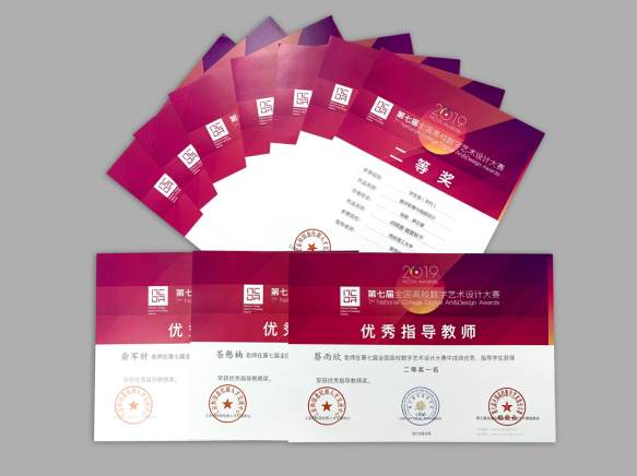 影像动画系,由苍慜楠老师指导的李晓勇、张权伟作品《唐兴庆宫花萼相辉楼的原真性数字化复原》,获得数字绘画类全国二等奖;由蔡雨欣老师指导的徐懿、茅芯蕾作品《点绛唇》,获得数字影像类全国二等奖。视觉传达系,由俞军财老师指导的杨越涵同学的作品《水果茶包装》,获得了视觉传达类全国二等奖。三位老师分别获得了全国优秀指导教师二等奖。