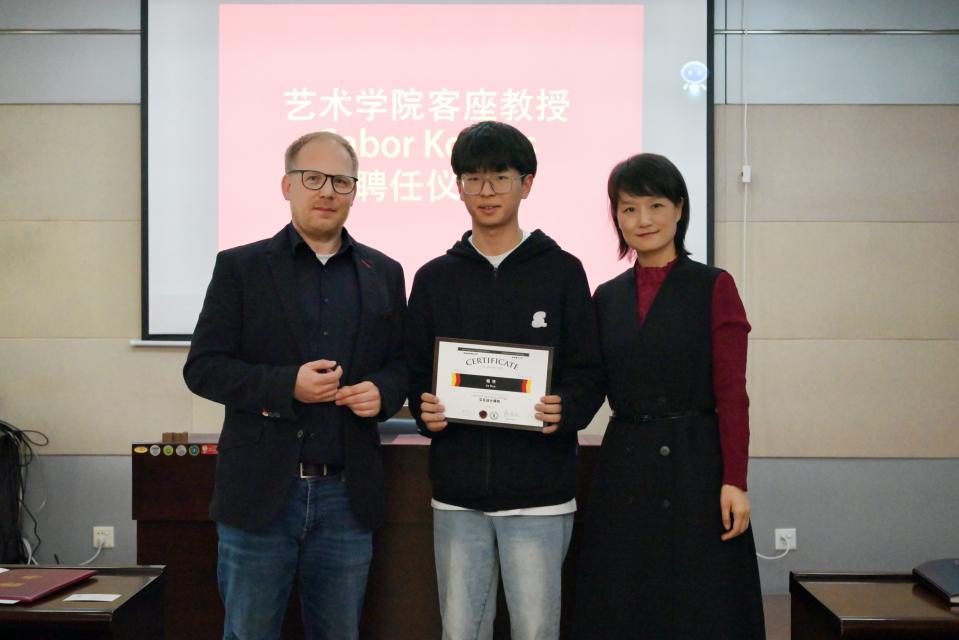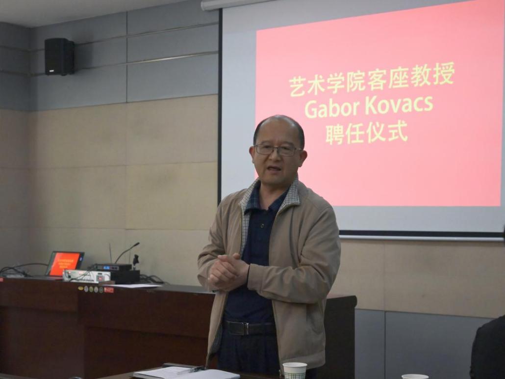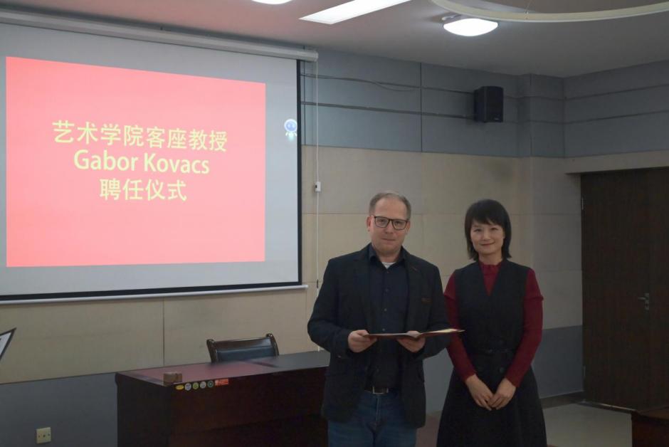 4月13日下午14:30,逸夫科技楼209会议室举行了德国SRH柏林应用科技大学教授Gabor Kovacs担任太阳成tyc122cc客座教授的授予仪式。国际合作与交流处处长亢文祥、太阳成tyc122cc经理薛艳敏、副经理孙浩章、王旭鹏、党委副书记胡有睿、各系主任以及部分员工代表参加了仪式,视觉传达系主任郭华担任了仪式主持。