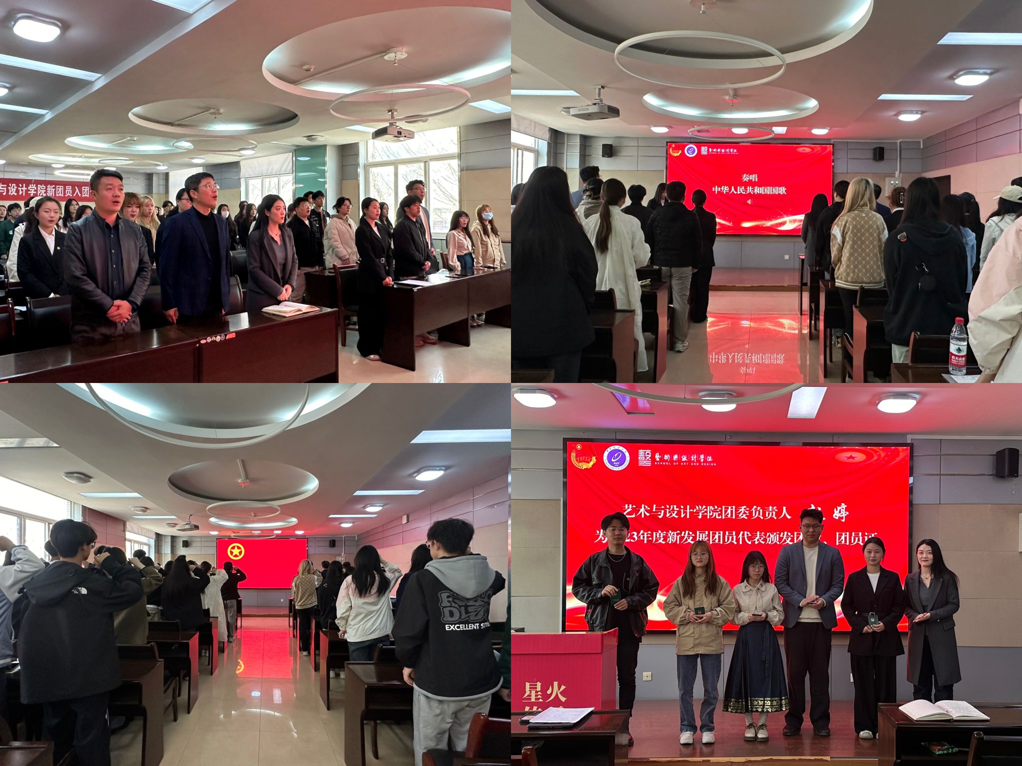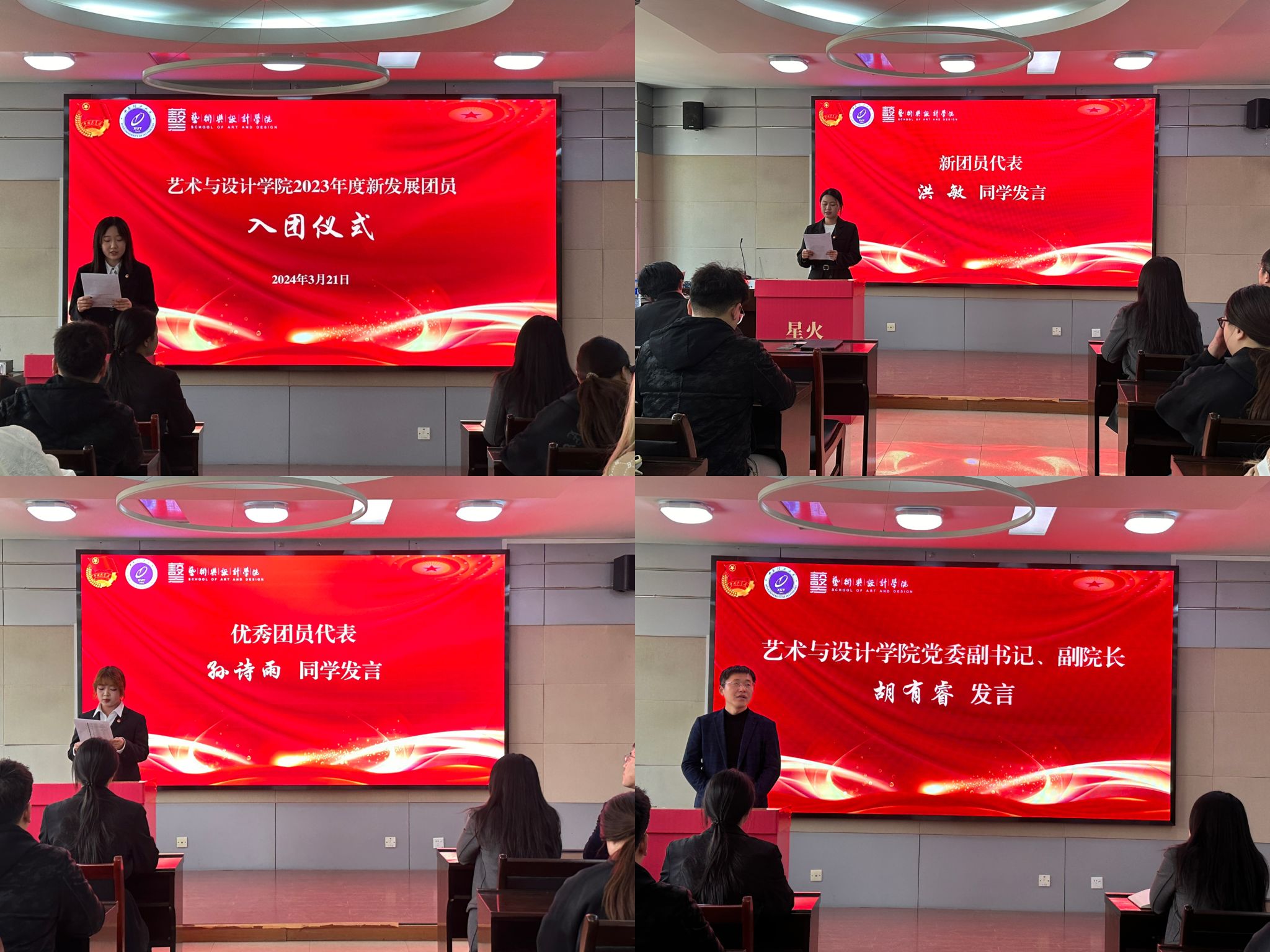 仪式在庄严的中华人民共和国国歌声中拉开帷幕。王一言宣布了2023年度新发展团员名单,赵婷为新发展团员代表佩戴团徽、颁发团员证。院团委组织部负责人徐睿作为领誓人带领新发展团员进行了入团宣誓。新团员代表洪敏发言,她代表全体新团员郑重承诺,要继承发扬共青团的优良传统,要把入团作为奋斗的新动力,在担当中历练,在尽责中成长,为实现中华民族伟大复兴的中国梦贡献青春力量。优秀团员代表孙诗雨发言,她号召新团员要誓词如铁,丹心如帜,履行团员义务,脚踏实地、求真务实,努力使自己成为综合素质全面发展、具有优秀品质、良好素养的新时代团员青年。