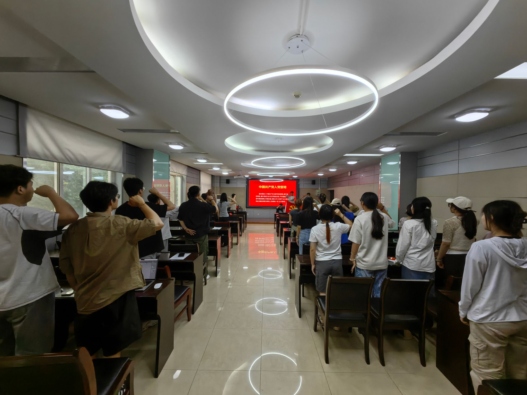 最后,全体成员共同观看了“中共一大”召开背后的保密故事党史纪实短片,重温先辈们那段光辉且艰难的岁月。党支部书记郑智聪带领全体党员重温入党誓词。