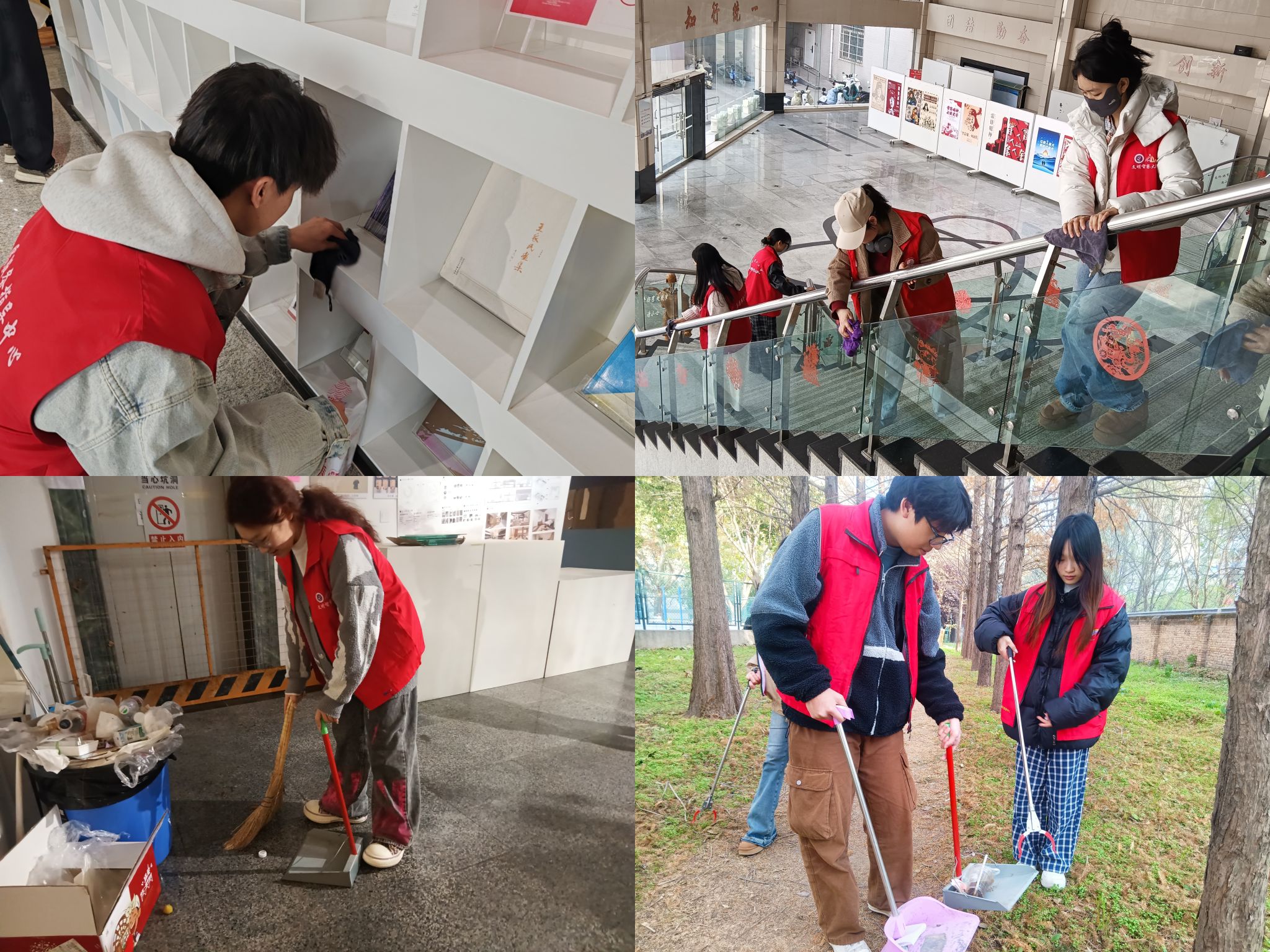 活动开展期间,志愿者们身着统一标识马甲,携带清洁工具,对教学楼公共区域、楼梯扶手、会议室等高频使用区域及校园绿化景观带进行深度清洁,以切实行动践行校园美容师职责。活动过程中,志愿者们化身环保理念传播者,号召大家携手参与环境维护,共同构建清新宜人的校园生态,营造整洁有序的学习生活环境。