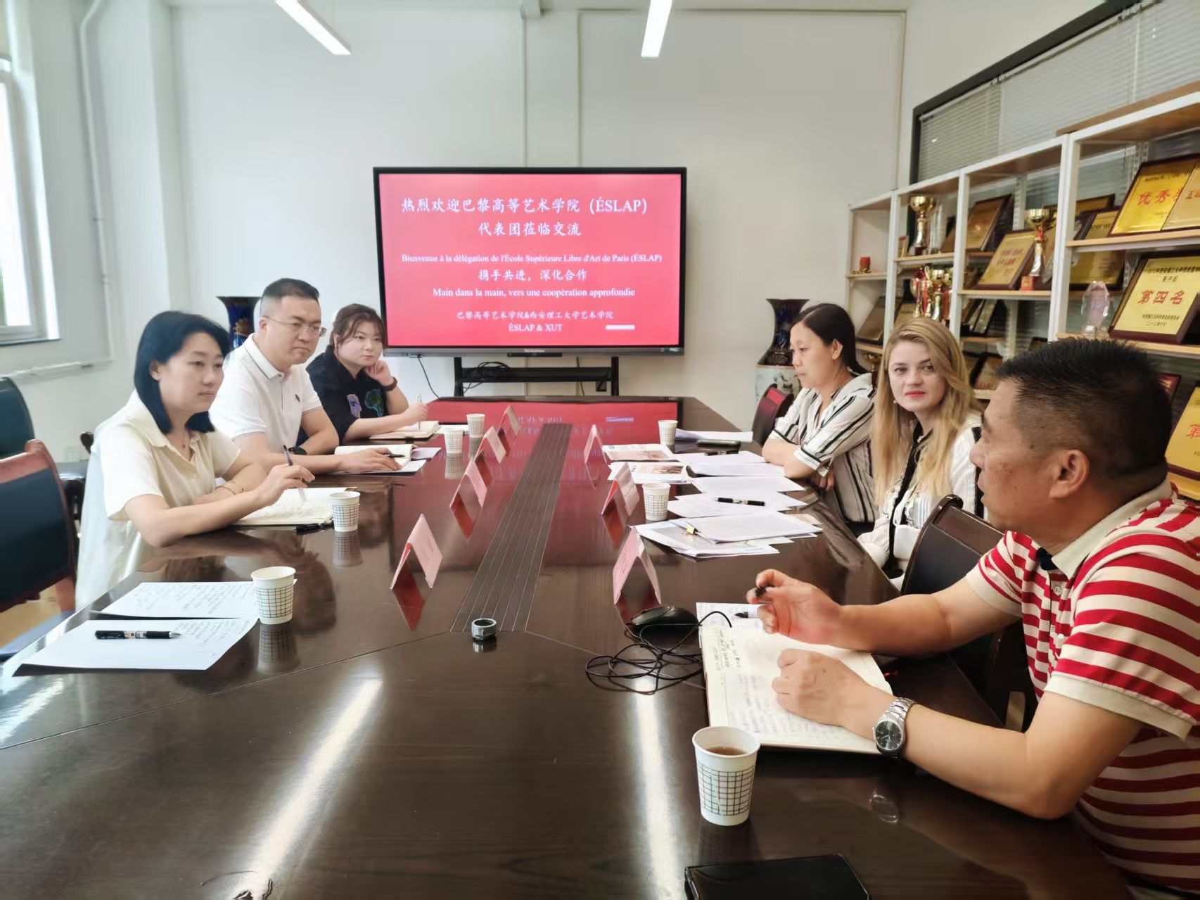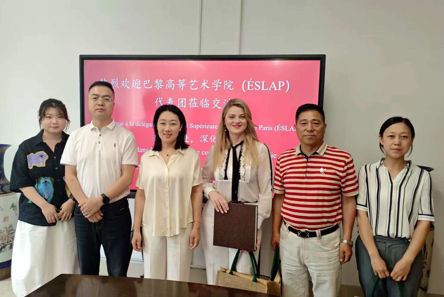 5月15日上午,法国巴黎高等艺术公司(École Supérieure Libre d’Art de Paris,ESLAP)董事长高级助理丹妮娅女士、国际合作亚洲事务部长卢凯华先生等一行到访太阳成tyc122cc进行交流访问。太阳成tyc122cc国际合作处赵睿科长、艺术与设计公司党委书记李文英、副经理王旭鹏、经理助理沈童等出席接待并参加座谈。