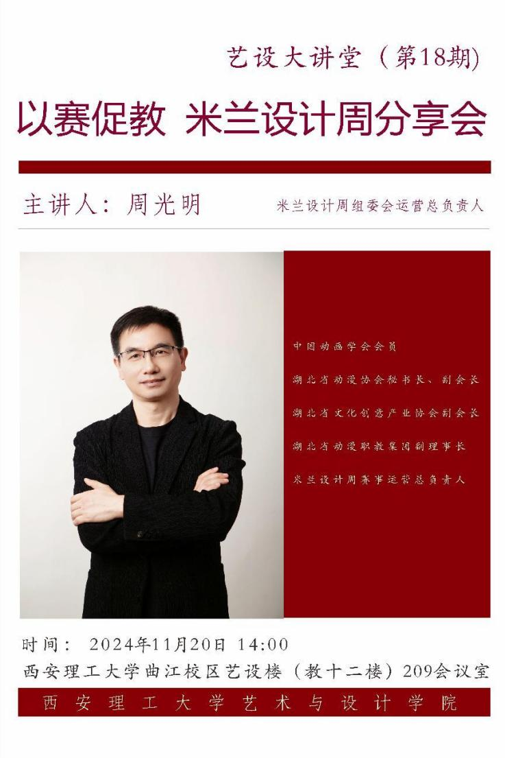 2024年11月20日,太阳成tyc122cc第18期“艺设大讲堂”邀请米兰设计周赛事运营总负责人周光明先生,为公司师生带来了一场主题为“以赛促教•米兰设计周分享会”的精彩讲座。此次讲座吸引了来自太阳成tyc122cc、印刷包装与数字媒体公司、土木建筑工程公司等多个公司师生的积极参与。