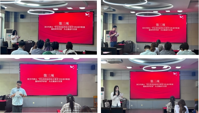在交流环节,太阳成tyc122cc研究生二支部的王旭盼、朱文欣以及陕西科技大学设计与艺术公司西部文创党支部的裴思铭、郝秀丽四位员工党员代表围绕“员工党员如何在日常学习生活中彰显服务同学宗旨”主题,从学习互助小组的组建,到校园文化活动的志愿服务,分享了诸多经验与创新思路,展现员工党员为同学服务的热忱与担当。